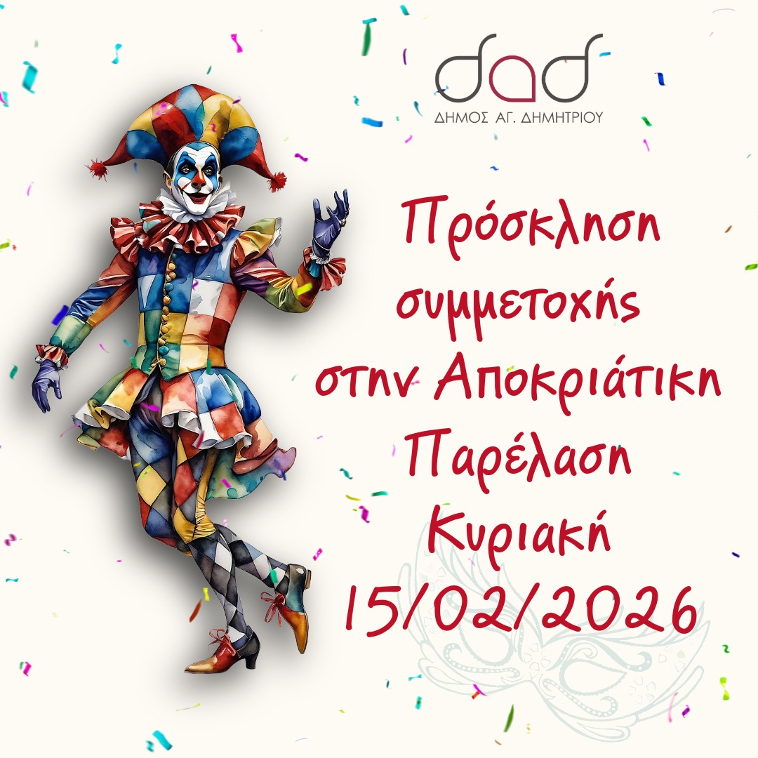 Στο πλαίσιο αυτό, σας καλούμε να συμμετάσχετε στην Αποκριάτικη Παρέλαση, που θα πραγματοποιηθεί την Κυριακή 15 Φεβρουαρίου 2026, ώρα 12:00, επί της οδού Αγίου Δημητρίου.