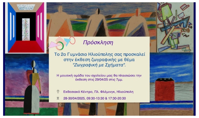 O Δήμος Ηλιούπολης έχει την τιμή να σας προσκαλέσει στην Έκθεση Ζωγραφικής του 2ου Γυμνάσιου Ηλιούπολης με τίτλο «Ζωγραφική με Σχήματα». Η έκθεση θα λάβει χώρα στο Εκθεσιακό Κέντρο του Δήμου Ηλιούπολης (Λεωφόρος Ειρήνης 14-16 & Αλκιβιάδου στην πλατεία Φλέμινγκ) από τη Δευτέρα 28 Απριλίου έως την Τετάρτη 30 Απριλίου 2025, καθημερινά 9:30 έως 13:30 το πρωί και 17:30 έως 20:30 το βράδυ.