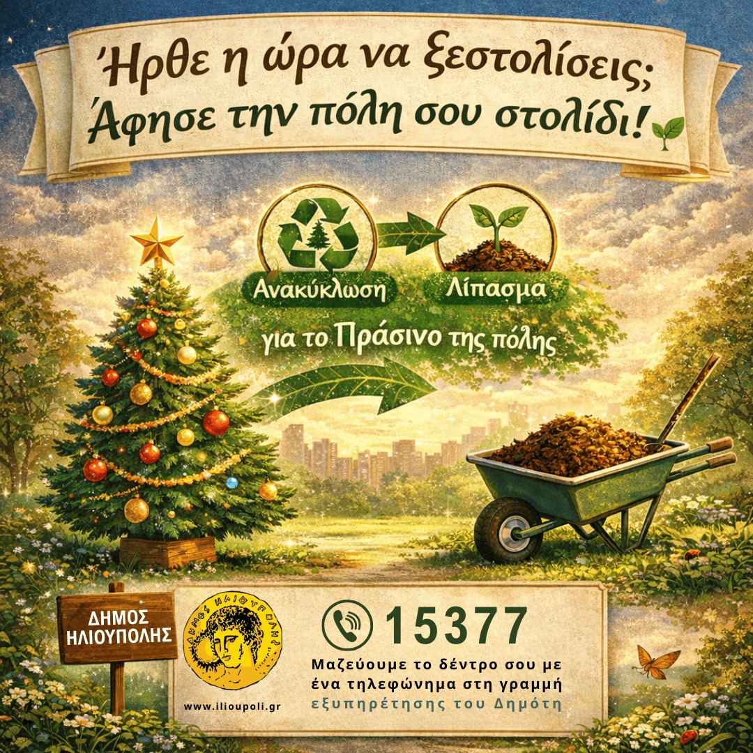 Ο Δήμος Ηλιούπολης με σεβασμό στις αρχές της Βιώσιμης Ανάπτυξης και Αειφορίας καλεί τους κατοίκους, με το πέρας της εορταστικής περιόδου, να μην απορρίπτουν τα φυσικά χριστουγεννιάτικα δέντρα στα κοινά απορρίμματα, αλλά να τα οδηγούν προς ανακύκλωση και κομποστοποίηση, συμβάλλοντας ενεργά στην προστασία του περιβάλλοντος και στη μείωση των αποβλήτων.