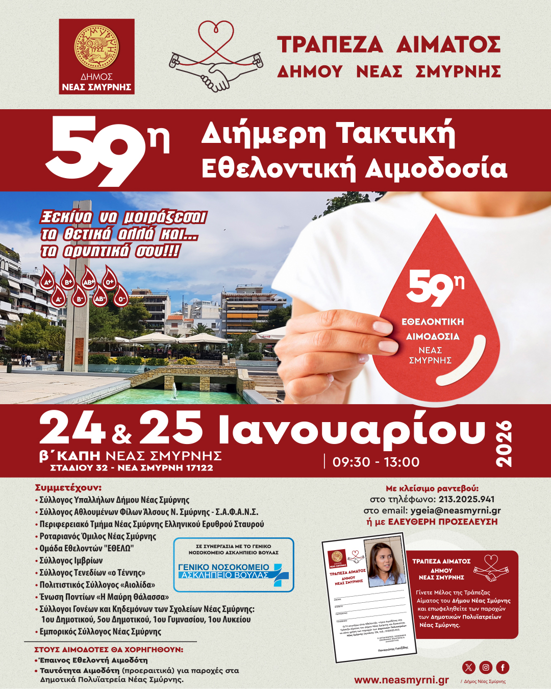 Διήμερη Τακτική Εθελοντική Αιμοδοσία διοργανώνει στις 24 και 25 Ιανουαρίου 2026 (09.30 – 13.00) η Κοινωνική Υπηρεσία – Τμήμα Υγείας του Δήμου Νέας Σμύρνης για την κάλυψη αναγκών της Τράπεζας Αίματος του Δήμου.