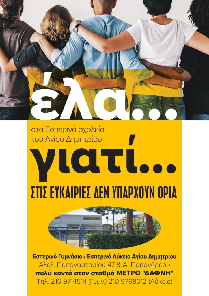 Τα εσπερινά σχολεία Γυμνάσιο και Λύκειο του Αγίου Δημητρίου δέχονται αιτήσεις για εγγραφές ενηλίκων και ανηλίκων μαθητών υπό προϋποθέσεις.