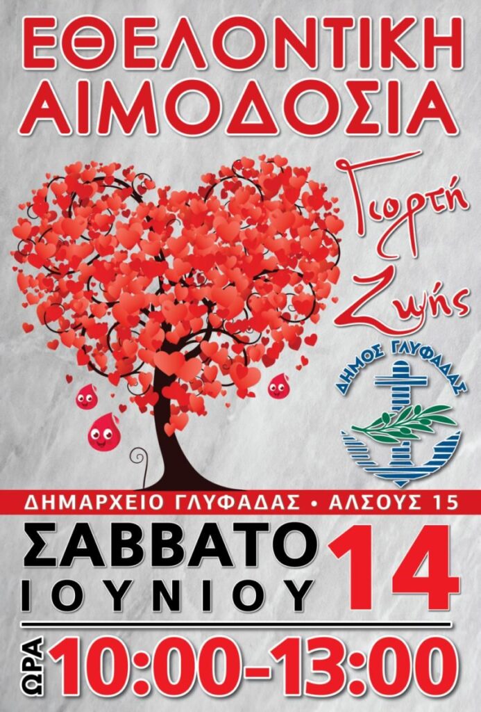Παγκόσμια Ημέρα Εθελοντή Αιμοδότη η 14η Ιουνίου και ο Δήμος Γλυφάδας, μέσω του Τμήματος Πρόνοιας, Κοινωνικής Πολιτικής και Ισότητας των Φύλων, διοργανώνει άλλη μία «Γιορτή Ζωής»: Μία εθελοντική αιμοδοσία, για την ενίσχυση της Τράπεζας Αίματος, η οποία δημιουργήθηκε τον Οκτώβριο του 2014, στην έναρξη της πρώτης θητείας του Δημάρχου Γλυφάδας Γιώργου Παπανικολάου.