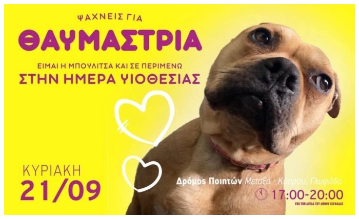 Την Κυριακή 21/9, από τις 5μμ έως τις 8μμ, στον Δρόμο των Ποιητών στη Γλυφάδα θα μας βρείτε παρέα με χαρούμενες μουσούδες που περιμένουν να συναντήσουν τον άνθρωπό τους.