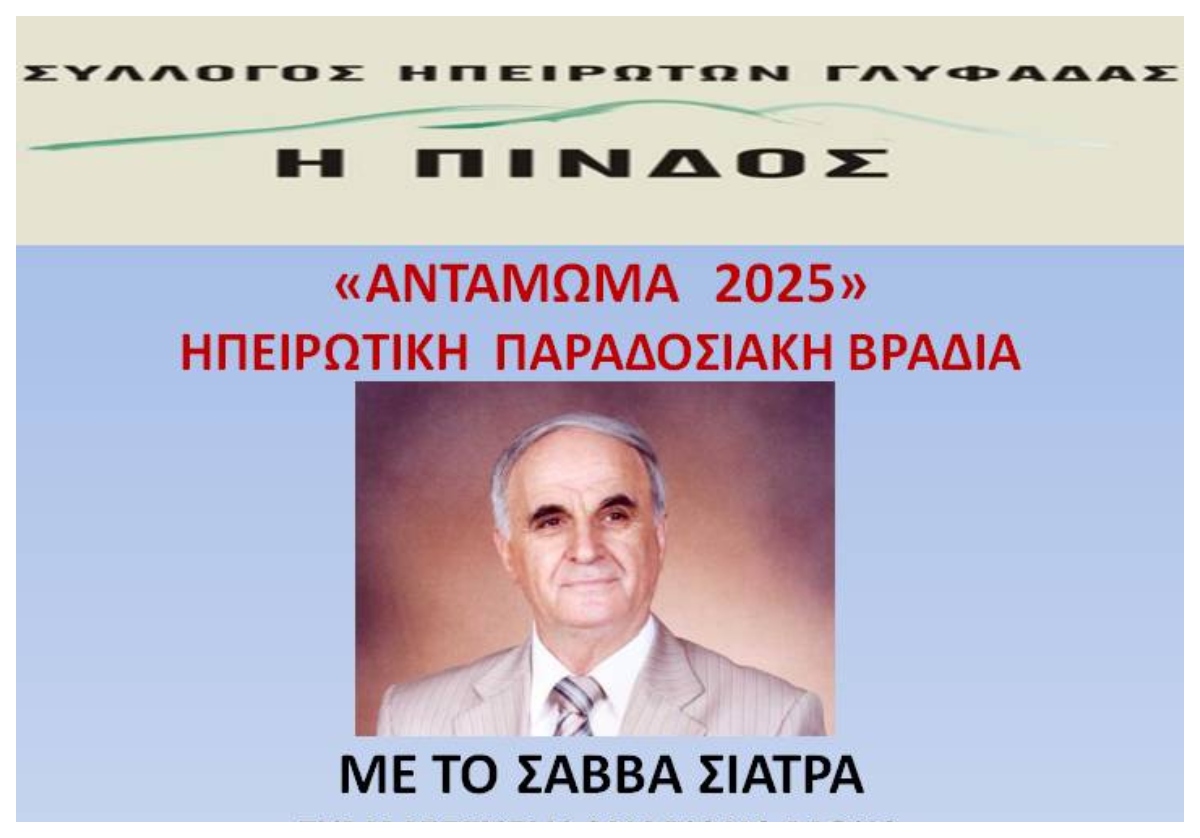 Ο Σύλλογος Ηπειρωτών Γλυφάδας “Η Πίνδος” και ο Δήμος Γλυφάδας, διοργανώνουν το “Αντάμωμα 2025”, το Σάββατο 27 Σεπτεμβρίου στις 20:30, στην πλατεία Μακεδονίας. Είσοδος ελεύθερη.