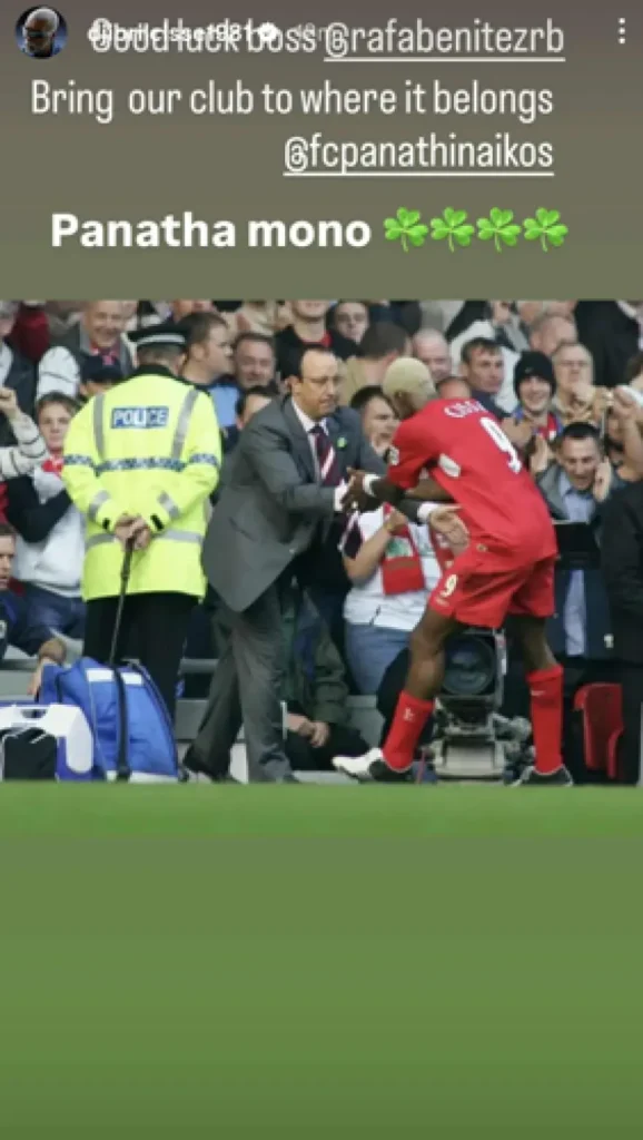 Είχε παίξει ως αλλαγή στον τελικό της Πόλης και είχε σηκώσει το τρόπαιο με προπονητή τον Ράφα Μπενίτεθ. Με το … θάρρος της συνεργασίας τους στη Λίβερπουλ ο Σισέ αφού έμαθε πως αναλαμβάνει την αγαπημένη του ομάδα (δεν έχει ανακοινωθεί από την ΠΑΕ Παναθηναϊκός ο Ισπανός) του έστειλε μήνυμα μέσα από το Instagram.