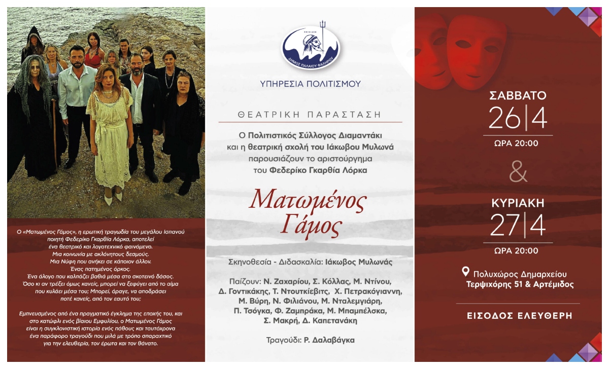 Ο Πολιτιστικός Σύλλογος Διαμαντάκι και η θεατρική σχολή του Ιάκωβου Μυλωνά παρουσιάζουν το αριστούργημα του Φεδερίκο Γκαρθία Λόρκα “Ματωμένος Γάμος” 26/4