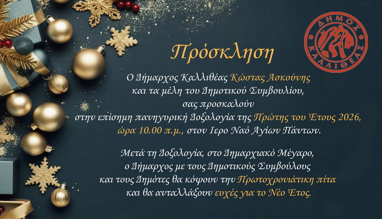 Ο Δήμαρχος Καλλιθέας Κώστας Ασκούνης και τα μέλη του Δημοτικού Συμβουλίου, σας προσκαλούν στην επίσημη πανηγυρική Δοξολογία της Πρώτης του Έτους 2026, ώρα 10.00 π.μ., στον Ιερό Ναό Αγίων Πάντων.