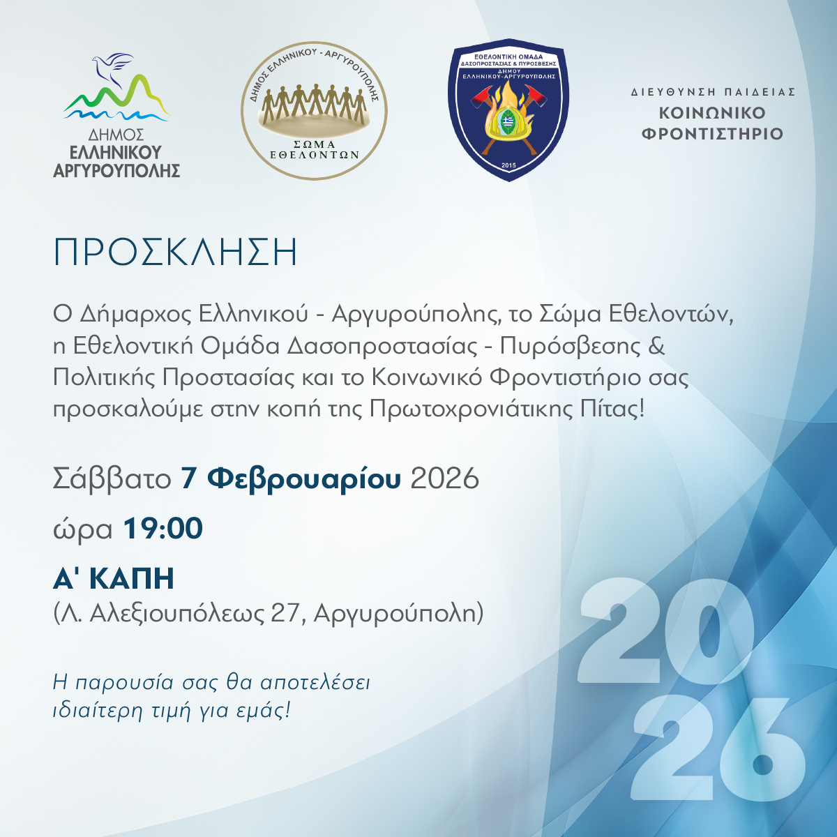 Με ιδιαίτερη χαρά σας προσκαλούμε στην Κοπή της Πρωτοχρονιάτικης Πίτας των Εθελοντών του Δήμου μας το Σάββατο 7 Φεβρουαρίου στις 19:00 στο Α’ ΚΑΠΗ (Λ. Αλεξιουπόλεως 27, Αργυρούπολη) σε μια βραδιά αφιερωμένη στους ανθρώπους που προσφέρουν με καρδιά!