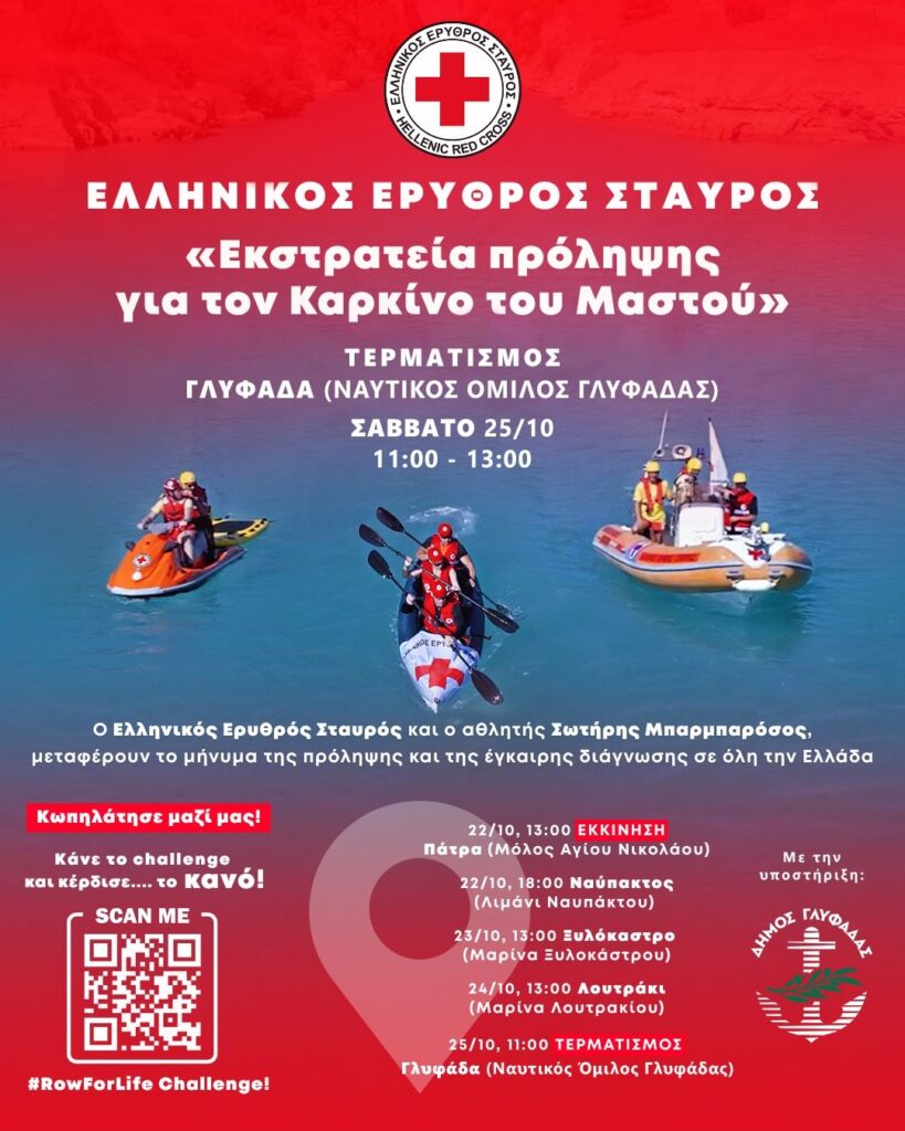Ο Ελληνικός Ερυθρός Σταυρός διοργανώνει το Σάββατο (25/10) και ώρες 11:00 έως 13:00, στον Ναυτικό Όμιλο Γλυφάδας (Διαδόχου Παύλου 42), μεγάλη εκδήλωση ενημέρωσης, ευαισθητοποίησης και πρόληψης για τον καρκίνο του μαστού.