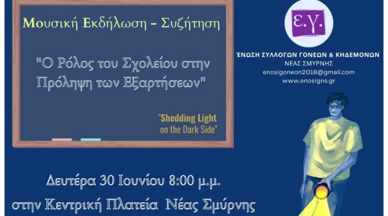 Η Ένωση Συλλόγων Γονέων και Κηδεμόνων Νέας Σμύρνης, στο πλαίσιο της Διεθνούς Ημέρας κατά της χρήσης και διακίνησης των Ναρκωτικών, σας προσκαλεί στις 30/6/2025 στην κεντρική πλατεία της Νέας Σμύρνης, στις 20:00 το απόγευμα, στην εκδήλωση με θέμα: