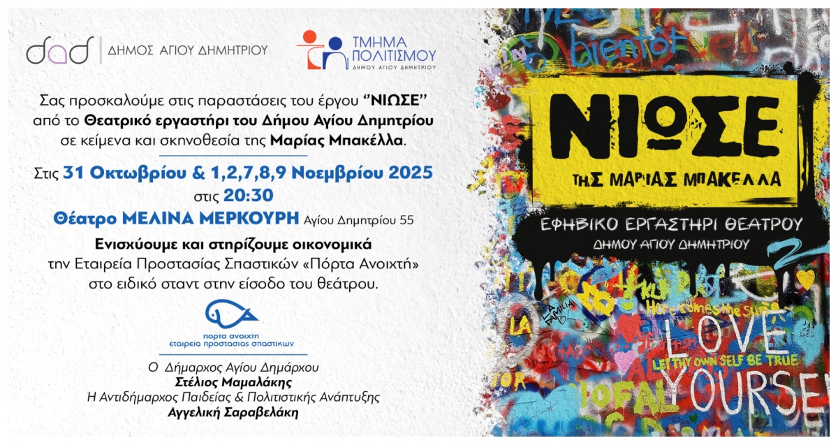 Οι έξι παραστάσεις, θα είναι δωρεάν για το κοινό και θα φιλοξενηθούν στο Θέατρο «Μελίνα Μερκούρη» (Δημαρχείο Αγίου Δημητρίου 55) στις 31 Οκτωβρίου & 1, 2, 7, 8, 9 Νοεμβρίου 2025. Αντί εισιτηρίου οι θεατές μπορούν να ενισχύσουν οικονομικά την Εταιρεία Προστασίας Σπαστικών “Πόρτα Ανοικτή” στο ειδικό σταντ που θα υπάρχει στην είσοδο του θεάτρου!