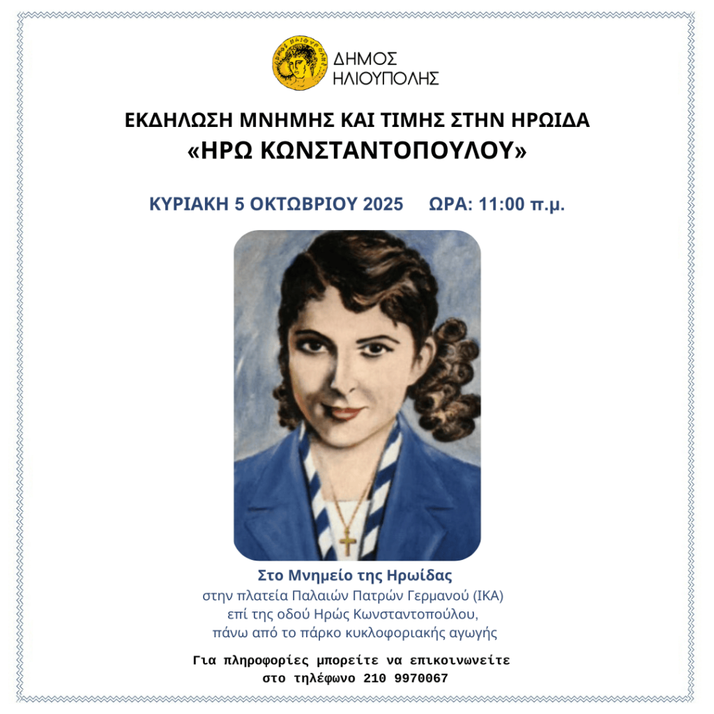 Ο Δήμος Ηλιούπολης σας προσκαλεί στην εκδήλωση προς τιμήν της ΕΠΟΝίτισσας ΗΡΟΥΣ ΚΩΝΣΤΑΝΤΟΠΟΥΛΟΥ, την Κυριακή 5 Οκτωβρίου 2025 και ώρα 11:00 π.μ. στο Μνημείο της Ηρωίδας στην πλατεία Παλαιών Πατρών Γερμανού (ΙΚΑ), επί της οδού ΗΡΟΥΣ ΚΩΝΣΤΑΝΤΟΠΟΥΛΟΥ.