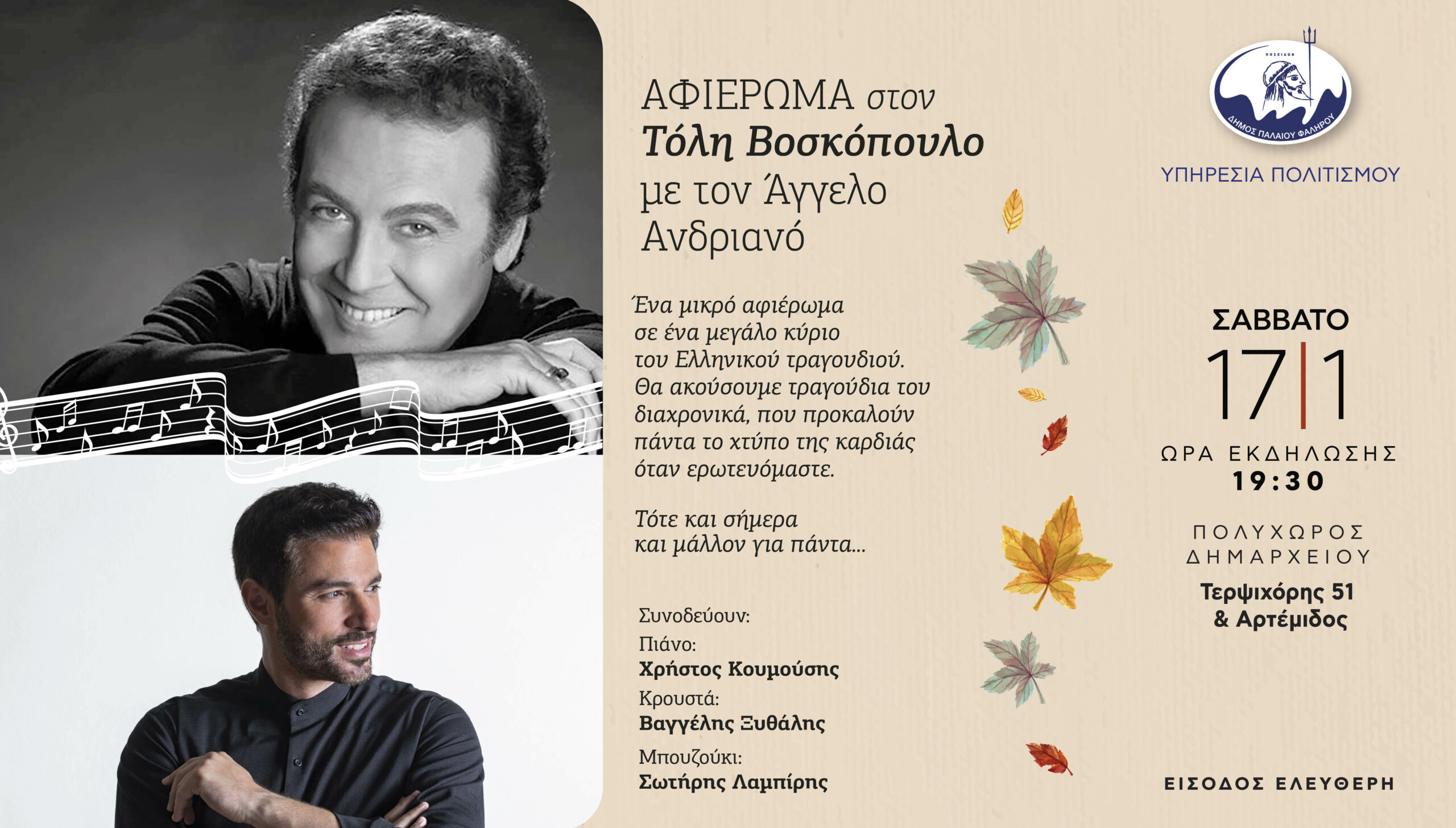 Στον Πολυχώρο του Δημαρχείου, οι παρευρισκόμενοι θα έχουν την ευκαιρία να απολαύσουν ένα μουσικό οδοιπορικό στις μεγάλες επιτυχίες που σφράγισαν την ιστορία του ελληνικού πενταγράμμου. Κεντρικός ερμηνευτής της βραδιάς θα είναι ο Άγγελος Ανδριανός, ο οποίος μαζί με μια ομάδα καταξιωμένων μουσικών, θα ζωντανέψει μελωδίες που προκαλούν πάντα συγκίνηση και ανασύρουν μνήμες.