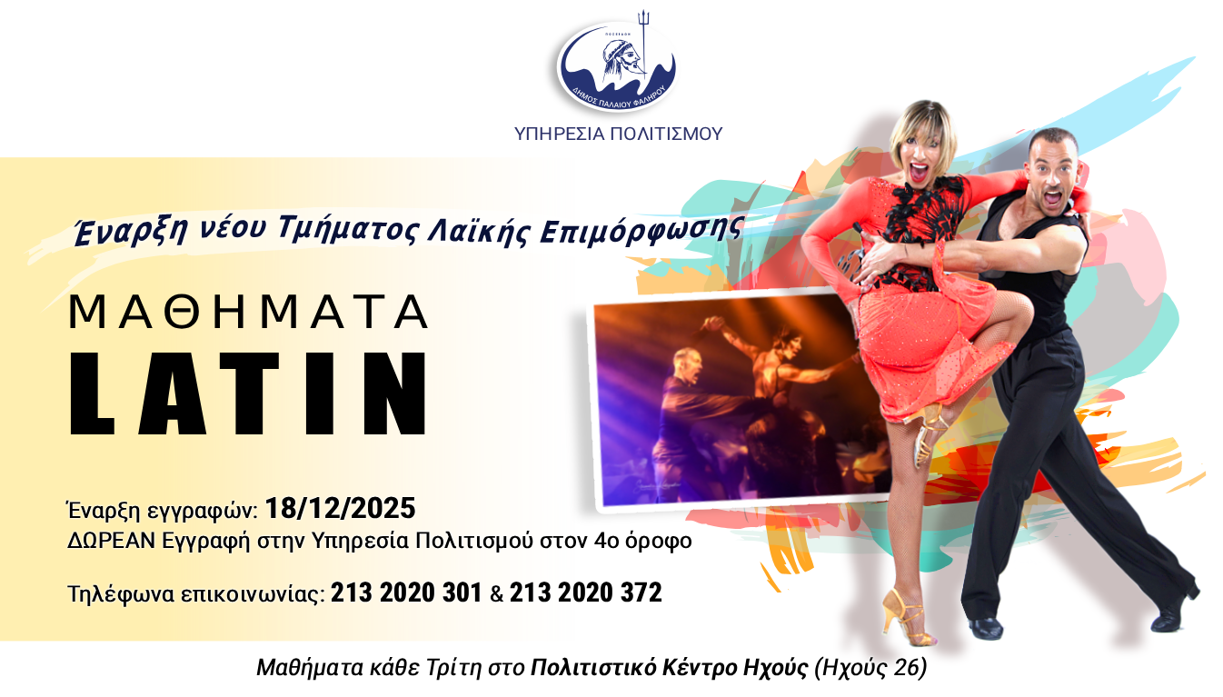 Ο Δήμος Παλαιού Φαλήρου και η Υπηρεσία Πολιτισμού εγκαινιάζουν ένα νέο τμήμα Λαϊκής Επιμόρφωσης, το τμήμα χορού Λάτιν. Από τη σάμπα , μέχρι η ρούμπα και το τσάιβ, κάθε χορός Latin αφηγείται μία ιστορία γεμάτη πάθος κι ένταση. Μετά από το έντονο ενδιαφέρον και αίτημα των κατοίκων της πόλης μας , το νέο τμήμα ξεκινάει .