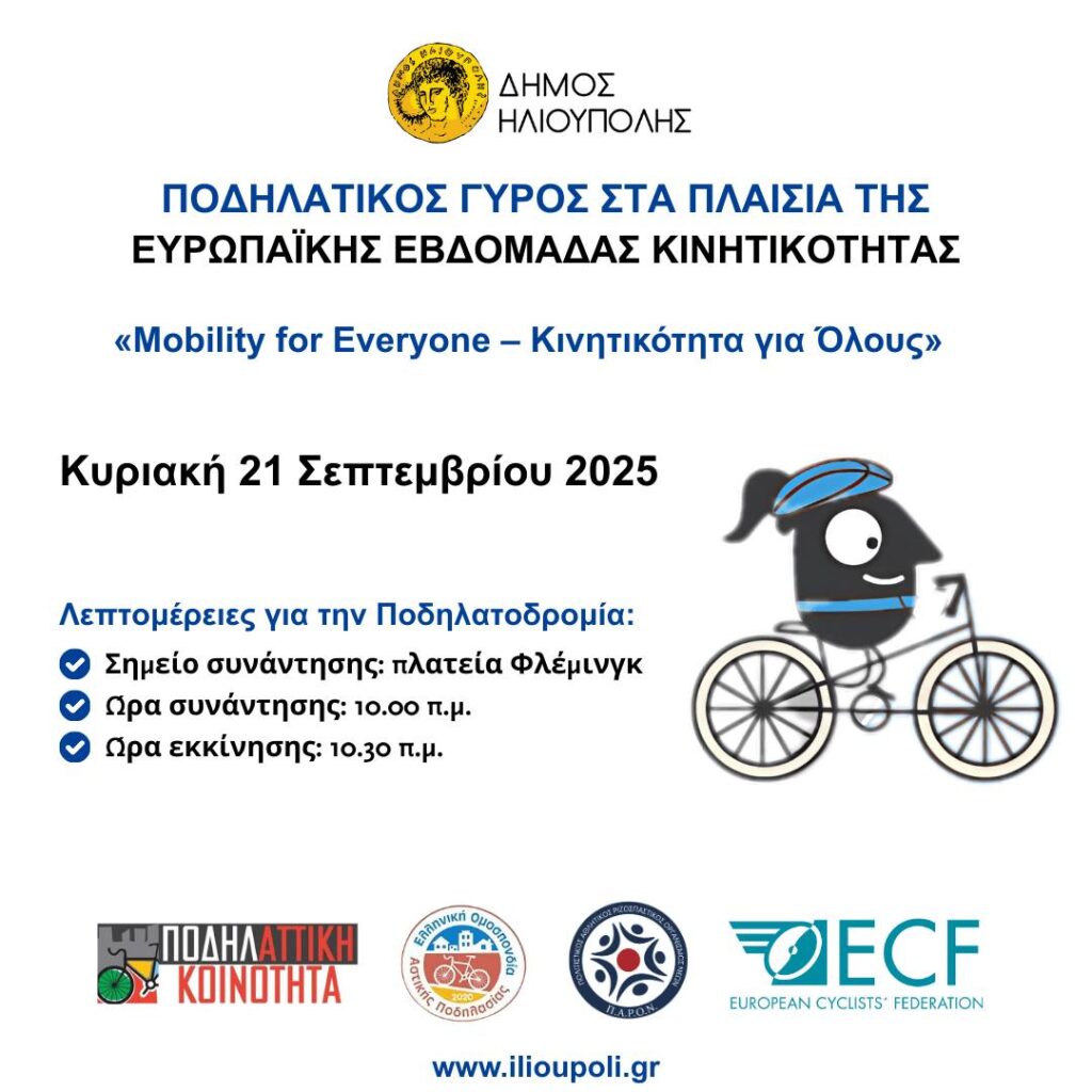 Ο Δήμος Ηλιούπολης συμμετέχει στην Ευρωπαϊκή Εβδομάδα Κινητικότητας (ΕΕΚ), που πραγματοποιείται από τις 16 έως τις 22 Σεπτεμβρίου, με θέμα «Mobility for Everyone – Κινητικότητα για Όλους», προσκαλώντας χιλιάδες κοινότητες σε όλη την Ευρώπη να στείλουν το μήνυμα πως οι βιώσιμες μεταφορές πρέπει να είναι προσβάσιμες σε όλους, χωρίς αποκλεισμούς.