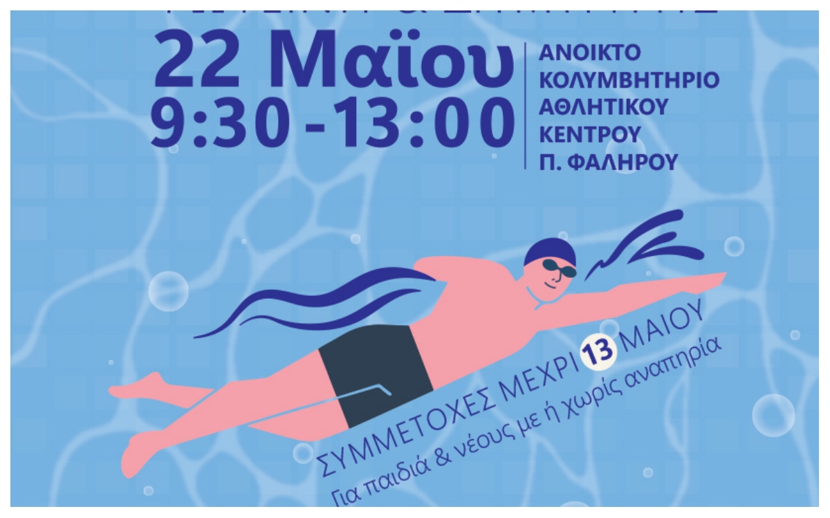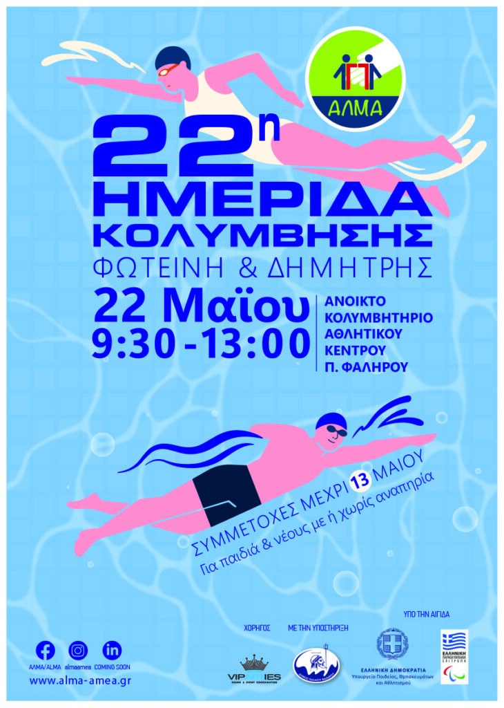 Έχουμε τη χαρά να σας προσκαλέσουμε στην 22η Ημερίδα Κολύμβησης “ΦΩΤΕΙΝΗ & ΔΗΜΗΤΡΗΣ” που διοργανώνει το ΑΛΜΑ την Πέμπτη 22 Μαΐου 2025 και ώρα 9.30πμ στο Ανοικτό Κολυμβητήριο Παλαιού Φαλήρου υπό την αιγίδα της Γενικής Γραμματείας Αθλητισμού & της Ελληνικής Παραολυμπιακής Επιτροπής και με την υποστήριξη του Δήμου Παλαιού Φαλήρου.
