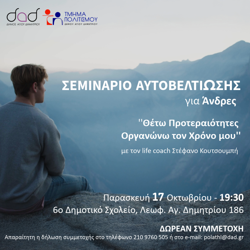 Άρχισαν οι αιτήσεις Δωρεάν συμμετοχής στα σεμινάρια αυτοβελτίωσης για άνδρες, από το Τμήμα Πολιτισμού του Δήμου Αγίου Δημητρίου, με θέμα: ”Θέτω προτεραιότητες – Οργανώνω τον χρόνο μου”.