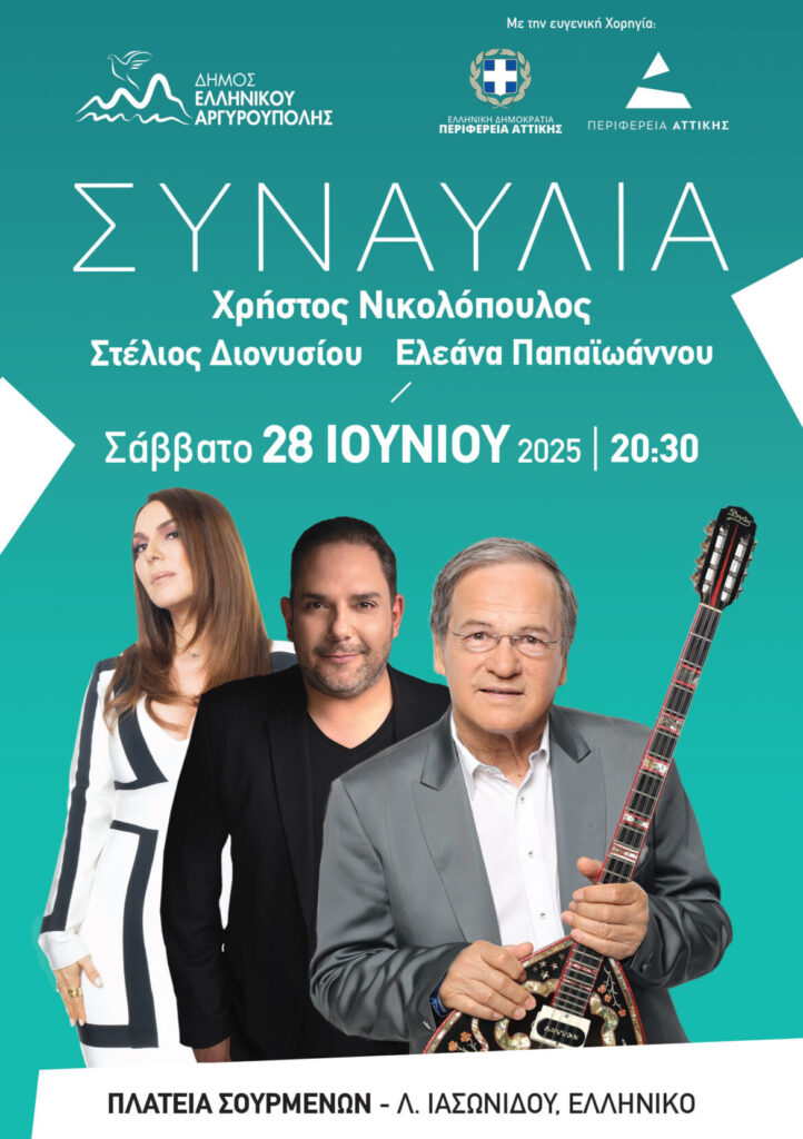 Ο Δήμος Ελληνικού – Αργυρούπολης, με την πολύτιμη στήριξη της Περιφέρειας Αττικής, προσκαλεί κατοίκους και επισκέπτες σε μια μοναδική μουσική βραδιά, το Σάββατο 28 Ιουνίου και ώρα 20:30, στην Πλατεία Σουρμένων (Λ. Ιασωνίδου, Ελληνικό).