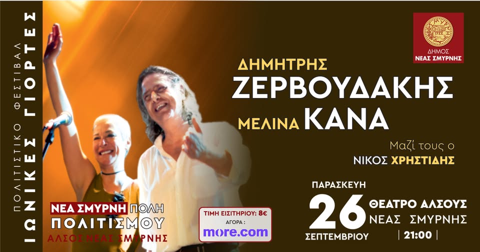 Με μια μεγάλη συναυλία της Μελίνας Κανά και του Δημήτρη Ζερβουδάκη, αύριο Παρασκευή 26 Σεπτεμβρίου, ολοκληρώνεται ο πρώτος κύκλος των Ιωνικών Γιορτών 2025