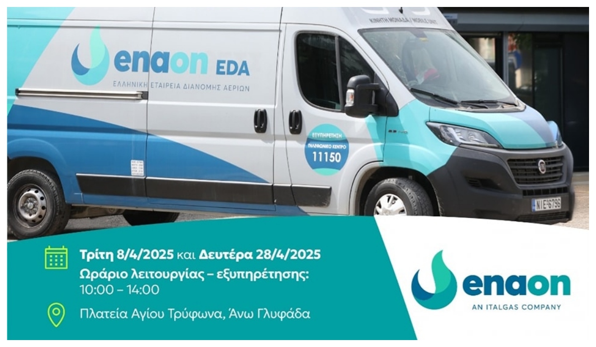 Η κινητή μονάδα ενημέρωσης της εταιρείας Enaon EDA, που αποτελεί τον αποκλειστικό διαχειριστή και διανομέα φυσικού αερίου στην περιοχή της Αττικής, θα βρίσκεται στην πλατεία Αγίου Τρύφωνα, στην Άνω Γλυφάδα, αυτή την Τρίτη 8 Απριλίου 10:00 -14:00, καθώς και τη Δευτέρα 28 Απριλίου, επίσης 10:00 -14:00.