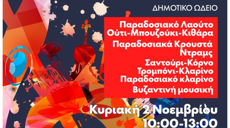 Το Δημοτικό Ωδείο Αγίου Δημητρίου οργανώνει την Κυριακή 2 Νοεμβρίου, από τις 10:00 έως τις 13:00, ανοιχτή παρουσίαση – γνωριμία με μουσικά όργανα, στο χώρο του ωδείου, Κλεάρχου 71.