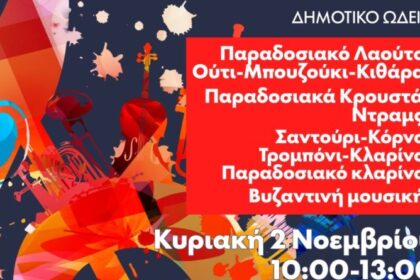 Το Δημοτικό Ωδείο Αγίου Δημητρίου οργανώνει την Κυριακή 2 Νοεμβρίου, από τις 10:00 έως τις 13:00, ανοιχτή παρουσίαση – γνωριμία με μουσικά όργανα, στο χώρο του ωδείου, Κλεάρχου 71. Οι ενδιαφερόμε...