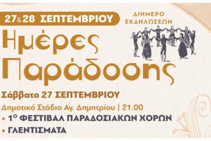 Με τις «Ημέρες Παράδοσης», που διοργανώνεται στις 27 και 28 Σεπτεμβρίου 2025, στο Δημοτικό Στάδιο Αγίου Δημητρίου, κορυφώνονται οι εκδηλώσεις του Φεστιβάλ της Πόλης του Αγίου Δημητρίου. Το σ...