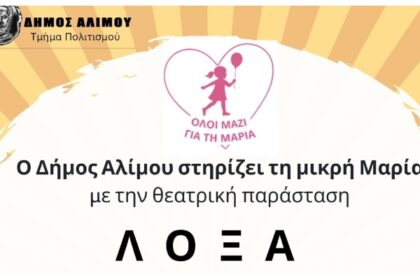 Ο Δήμος Αλίμου διοργανώνει φιλανθρωπική θεατρική παράσταση, για να συγκεντρωθούν χρήματα για τη νοσηλεία στις ΗΠΑ της 13χρονης Μαρίας Καμενάκη, που πάσχει από σάρκωμα Ewing. Το Σάββατο 4 Οκτωβρίου, στ...