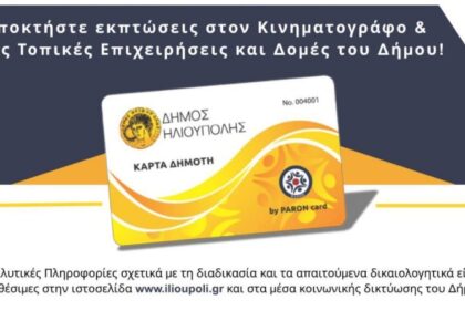 Ο Δήμος Ηλιούπολης σε συνεργασία με τον Πολιτιστικό Οργανισμό «Π.Α.Ρ.Ο.Ν.», ανακοινώνει την έναρξη του προγράμματος «Κάρτα Δημότη», με σκοπό τη στήριξη της τοπικής αγοράς και των δημοτών. Οι κάτοχοι τ...