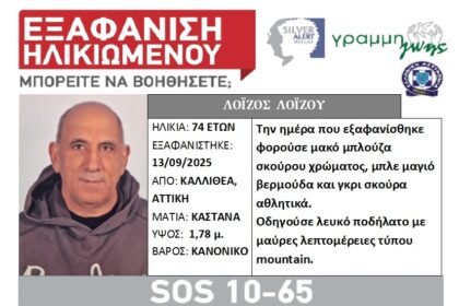 Ο Λοΐζος Λοΐζου, 74 ετών, εξαφανίστηκε από το σπίτι του, στην Καλλιθέα Αττικής, το πρωί της 13/09/25, όταν έφυγε με το ποδήλατό του χρώματος λευκού με μαύρες λεπτομέρειες τύπου mountain, με κατεύθυνση...