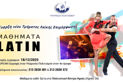 Ο Δήμος Παλαιού Φαλήρου και η Υπηρεσία Πολιτισμού εγκαινιάζουν ένα νέο τμήμα Λαϊκής Επιμόρφωσης, το τμήμα χορού Λάτιν. Από τη σάμπα , μέχρι η ρούμπα και το τσάιβ, κάθε χορός&...