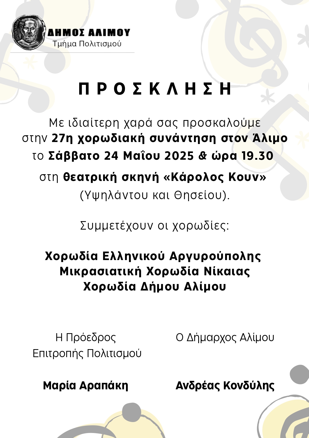 Το Σάββατο 24 Μαΐου 2025 θα πραγματοποιηθεί η 27η Χορωδιακή Συνάντηση στον Άλιμο.